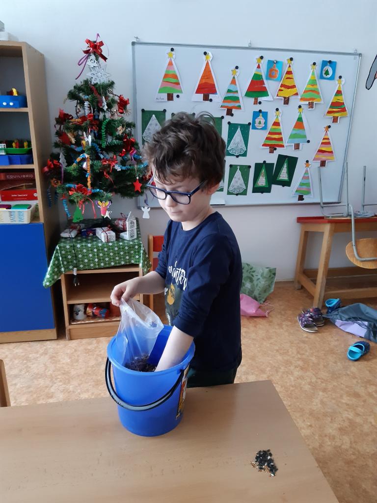 V této době také začínáme pravidelně s dětmi přikrmovat ptáčky na našem školním hřišti.