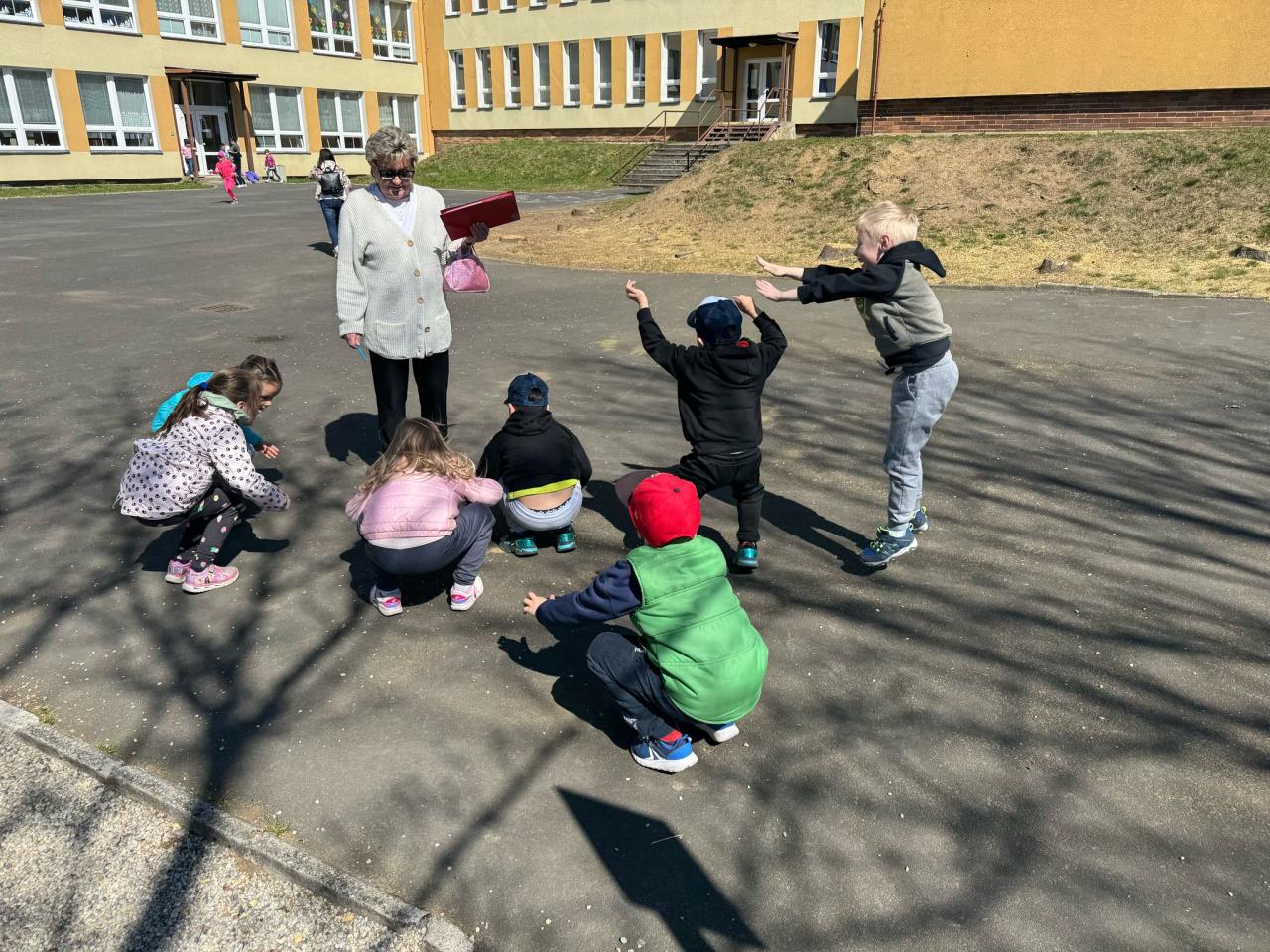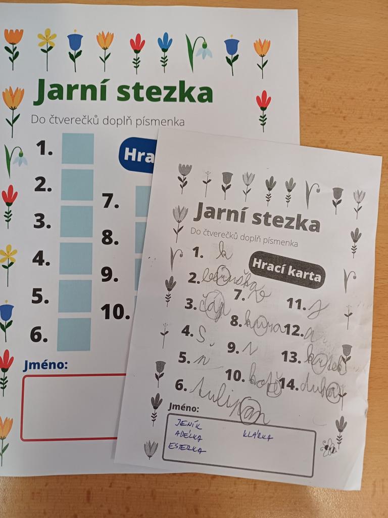 Počasí přálo, a tak se všechna oddělení školní družiny vydala na stezku plnou úkolů s jarní tematikou Ve stezce bylo celkem 10 stanovišť, kde děti plnily různé úkoly a odpovídaly na otázky spojené s jarním obdobím. Po splnění úkolů zapsaly do tajenky správné písmeno.