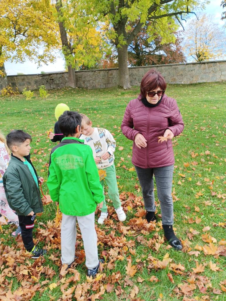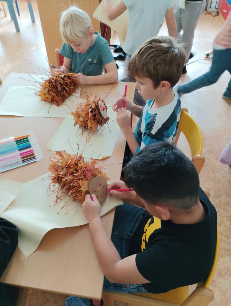Během našich aktivit venku jsme nezapomněli sledovat, jak se příroda mění a připravuje na zimu. Pozorovali jsme, jak převládající zeleň z konce léta pozvolna střídá celá paleta barev, která rozzářila stromy a keře. Barevné spadané listy zlákaly děti k veselému dovádění a vytvoření nádherné housenky.