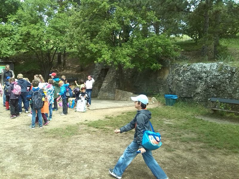 V jedenáct hodin si pro nás přišla naše paní průvodkyně a my jsme vyrazili. Hned za vstupní bránou si nás seřadila a upozornila nás, že nemáme osahávat krápníky v jeskyních a že si máme dávat pozor na kluzkou podlahu, protože do jeskyň prosakuje voda, která vykouzlila celou tu vápencovou nádheru! A měla pravdu. Byla to krásná podívaná! V každé větší jeskyni se zastavila a vyprávěla nám o historii vápencových výtvorů, proč a jak vznikají, o pověstech, které se o nich vyprávějí. Všechna zajímavá místa byla zvláštně nasvícena a nechala nás, ať se na všecko, co nás zajímá, vyptáváme. Prohlídka trvala hodinu, místy jsme prolézali úzkými tunely a místy se nám nad hlavami otevřely obrovské jeskyně, kterým se říká DÓMY. Zdolali jsme hodně schodů a dostali jsme se až do hloubky 50 metrů pod povrch. Tady už nebyl ani žádný signál, ale jeskyně měly jednu výhodu, kterou nám vysvětlila paní průvodkyně: byla zde stálá teplota 10 stupňů, takže v parném létě i v obrovských mrazech zde bylo příjemně. Možná proto zde archeologové našli tolik kosterních pozůstatků pravěkých zvířat a dokonce i člověka. Nejstarší byl nález kostí pravěkého medvěda – staré byly přes 800 000 let! To se nám moc líbilo. Prohlídku jsme zakončili sportovním výkonem – vyšlapali jsme dlouhéééé točité schody téměř až na povrch a zjistili jsme, jak vypadá absolutní tma – to když paní průvodkyně na minutu vypnula celé osvětlení. Ještě, že to řekla předem, i tak se někteří z nás báli J .