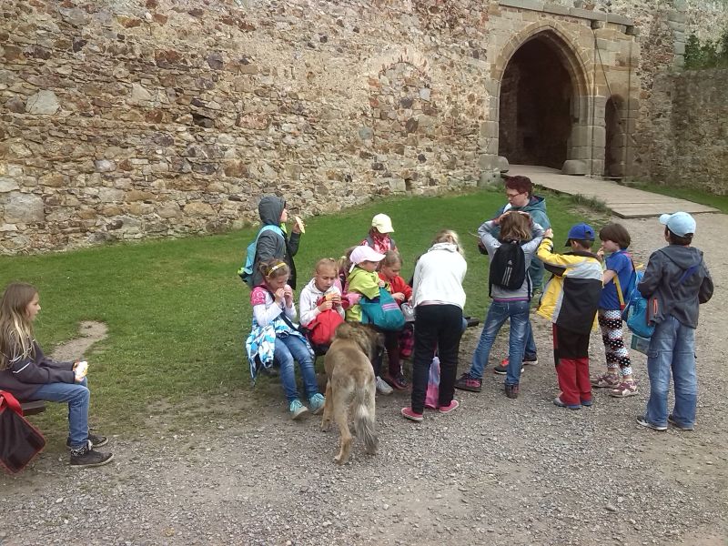Kousek od jeskyň se nacházejí dva hrady: Točník a Žebrák. A tak nás autobus odvezl za chvilku na místo. Z Žebráku po válečných nájezdech zůstala jen obrovská kulatá věž, a proto jsme se rozhodli pro návštěvu Točníku. Vyšlápli jsme táhlý kopec a přivítala nás vstupní brána, ke které se člověk dostal přes hradní příkop. V příkopu seděli jako velké hnědé balvany medvědi, ale byli hodně daleko, takže jsme z nich viděli jen málo. Po zaplacení vstupenek byl celý hrad jen náš, paní učitelky si nevzaly průvodce a rozhodly se, že si hrad prohlédneme sami. A bylo se na co dívat! Hrad byl poměrně zachovalý, prolezli jsme ho celý a dokonce jsme se podívali i na hradby a pokochali se místními kopci, lesy a výhledy do krajiny.