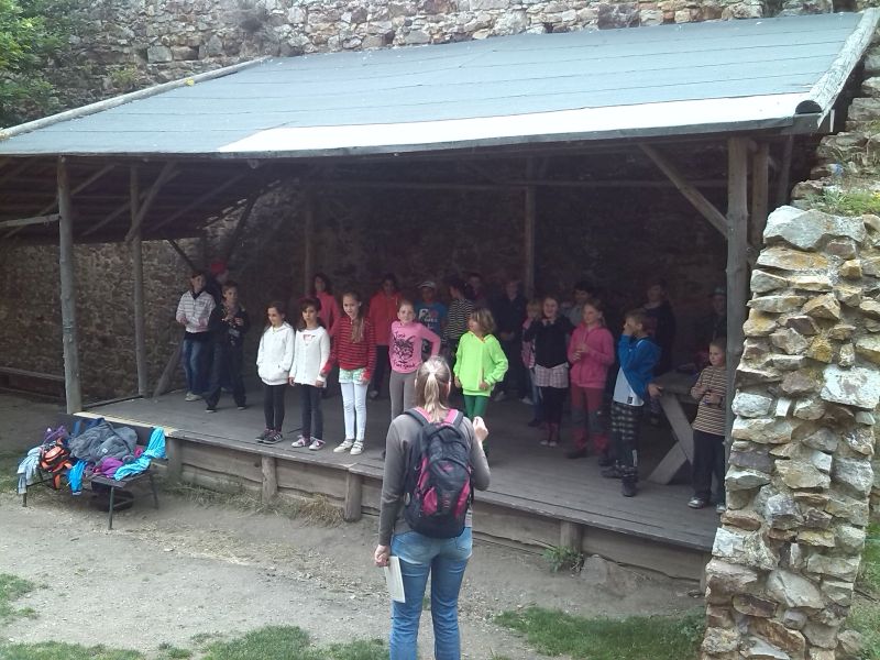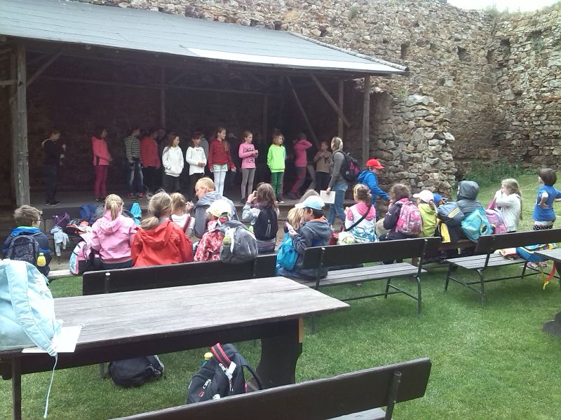 Na jednom nádvoří bylo dřevěné podium a lavičky. A přišel čas na překvapení! Čtvrťáci si s paní učitelkou připravili vystoupení pro třeťáky, byla to balada o hradní paní a moc se jim povedla. Třeťáci se bavili a celé si to skvěle užili.