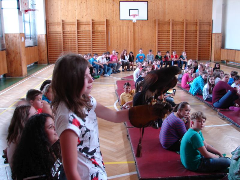 V pondělí 27.června čekal na žáky I. i II.stupně poslední výchovně vzdělávací pořad s názvem Dravci, sovy a člověk. Pan Jan Brož ze Sokolnického dvorce Falker seznámil děti s dravci z naší přírody. Přednáška byla velmi zajímavá, ale nejvíce se asi dětem líbilo, že si mohly zahrát na sokolníky - amatéry, kdy dravci přistávali na jejich nastavených pažích. Viz fota, která za II.stupeň pořídil Mgr. Michal Vlček.