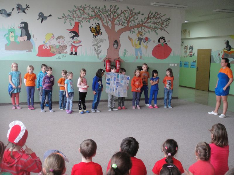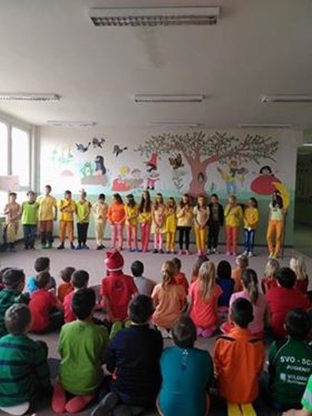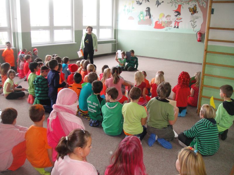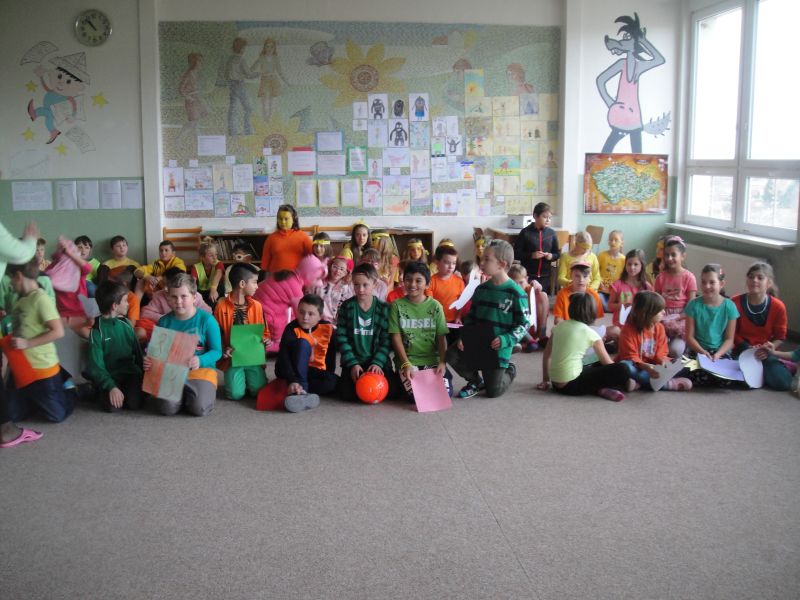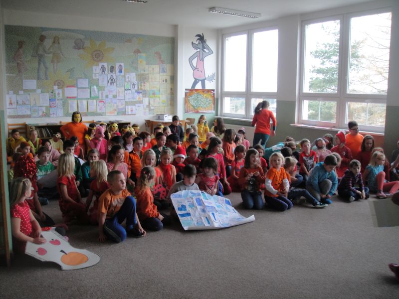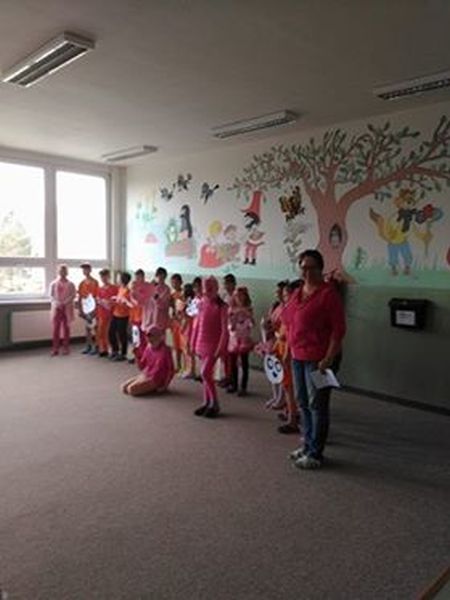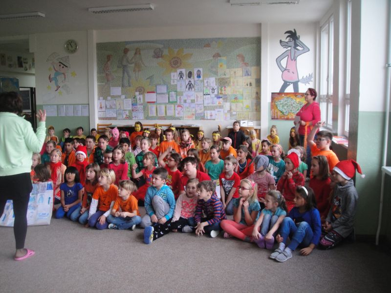 Jak je již téměř tradicí, nadcházející zima nás nevítá blankytnou oblohou, mrazivými rány a nadílkou sněhu, ale pravými podzimními plískanicemi. Jednotvárnou šeď tohoto období projasnil žákům prvního stupně „Barevný den“. V pátek 1. prosince tak přišli všichni žáci 1. - 5. třídy, učitele nevyjímaje, oblečeni do „kmenových“ barev své třídy: modré, červené, zelené, žluté, růžové a společné oranžové. Do školy tak zavítali modří prvňáci, červení čerti a berušky ze druhé třídy, zelené žabky a fotbalisté ze třetí třídy, růžoví čtvrťáci překvapili maskotem – růžovoučkým prasátkem a největší uznání sklidili intergalaktičtí Žluťáci, kteří dorazili obtíženi dárečky a něčím na zub i pro pozemské našince. Zároveň si každá třída připravila vlajku, erb či totem v třídních barvách a také písničku, básničku nebo vyprávění, ve kterých se tyto barvy vyskytovaly. Všichni jsme se navzájem pobavili a na závěr se rozloučili : „Slunce v duši a barvy v srdci“!