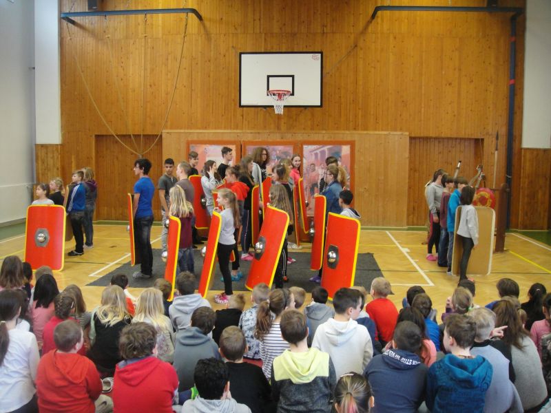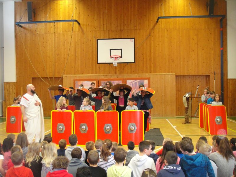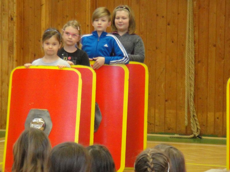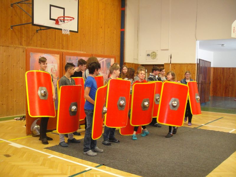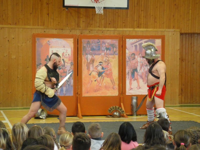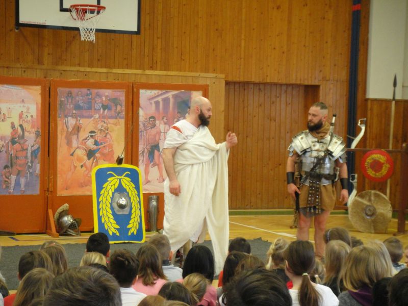 Ráno 12. 3. 2019 k nám již poněkolikáté dorazila z Pardubic skupina historického šermu – Pernštejni. Tématem byl tentokrát starověký Řím, gladiátoři, césarové, období konce republiky. Vyprávění o době 1. století před naším letopočtem ukazovalo krizi římské republiky a její morálky, krutosti vládců. Povídání o Juliu Caesarovi, Nerovi, Augustovi či Claudiovi bylo poutavé, poučné i zábavné. Někteří z žáků si vyzkoušeli, jak probíhal výcvik legionářů se štíty postavenými do útvarů, tzv. želv, které zabraňovaly proniknutí nepřátel a které skýtaly legionářům bezpečí. Přestože štíty jako makety byly mnohonásobně lehčí než ty skutečné, děti byly po pár minutách držení těchto štítů značně unavené. Oživením celého vyprávění byl jako vždy krátký souboj – tentokrát gladiátorský – s dobovými zbraněmi.