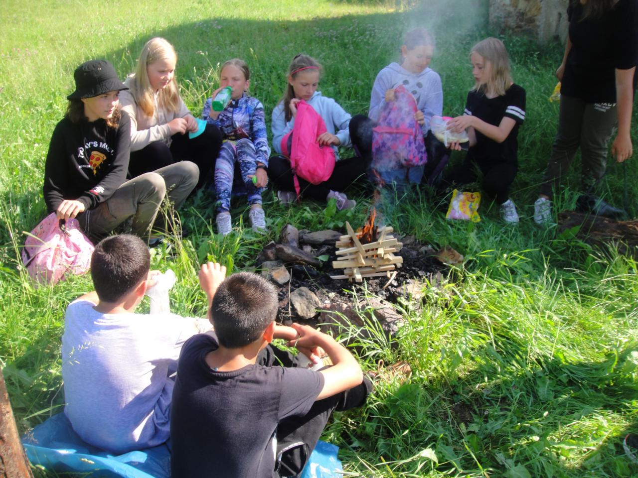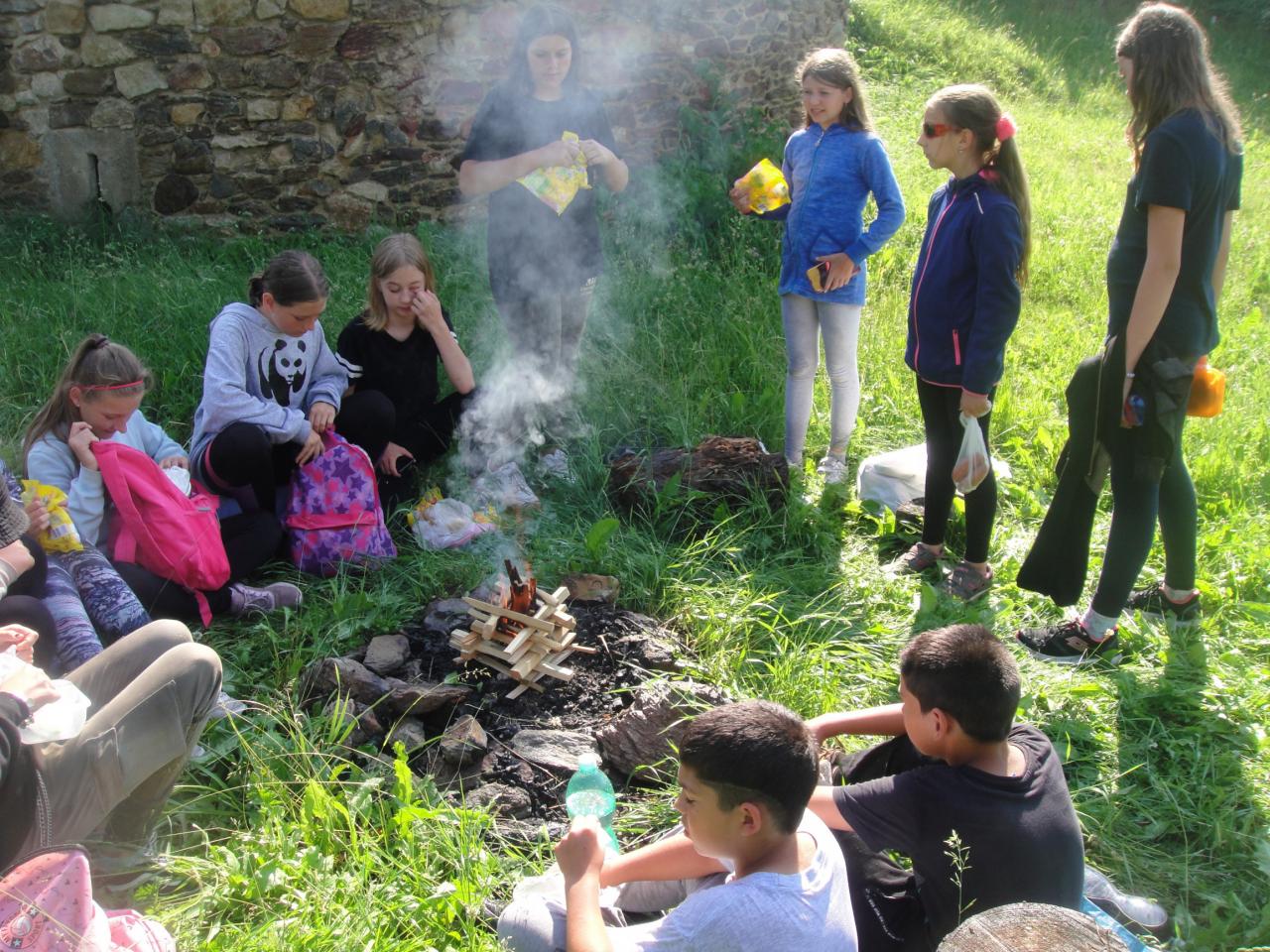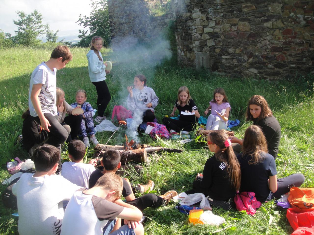 Ve čtvrtek 24. 6. jsme se vydali naposledy na společnou akci na 1. stupni. Čekalo nás opékání vuřtů a hry v areálu bochovského hradu Hartenštejn. Cestu nahoru nám znepříjemnil a ztížil prudký liják a bouřka, přesto všichni statečně doputovali až na místo. Úplně promočení jsme nedočkavě vyhlíželi sluníčko, které nás vyslyšelo a po chvíli se na nás začalo usmívat. Stihli jsme uschnout, podařilo se nám rozdělat oheň, opéci si dobroty, zazpívat si i zahrát hry. O dobré náladě svědčí i úsměvy dětí na fotografiích. Poděkování patří tatínkovi, který nám pomáhal, rodičům, kteří nás později na hradě také navštívili, a naší Ádě, která zajistila klíče od hradu.
