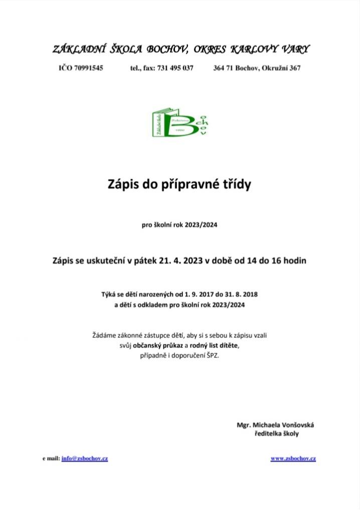Více informací u ředitelky školy, nejlépe na tel. 732 721 719, případně e-mailem na info@zsbochov.cz